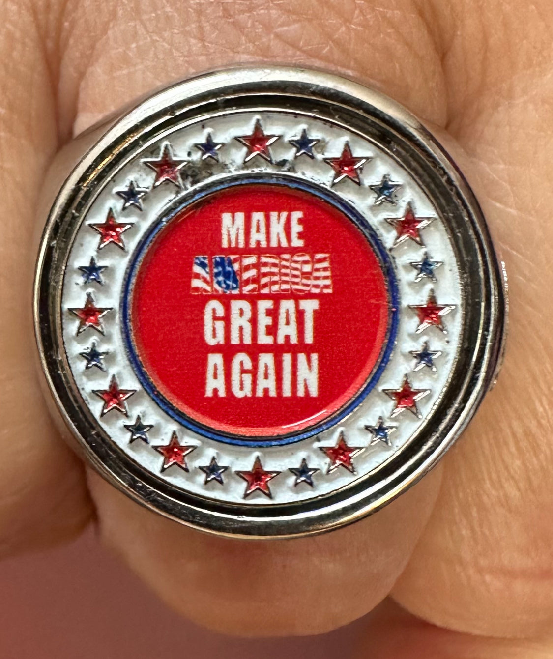 The Make America Great Again FLAG deCAPitator ring bottle cap and can tab opener busts open your favorite beverage with a flick of the wrist. Made of stainless steel. Made with Star cubic zirconia. Comes in sizes 5-15 with patented ring sizer. Color Silver. Ring goes on your middle finger for best leverage.